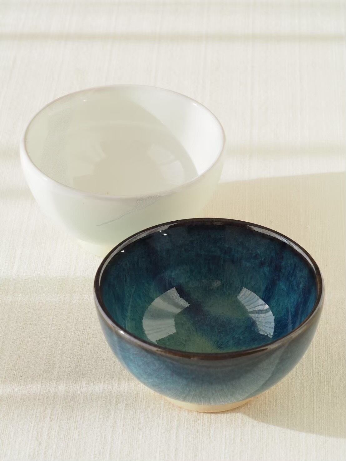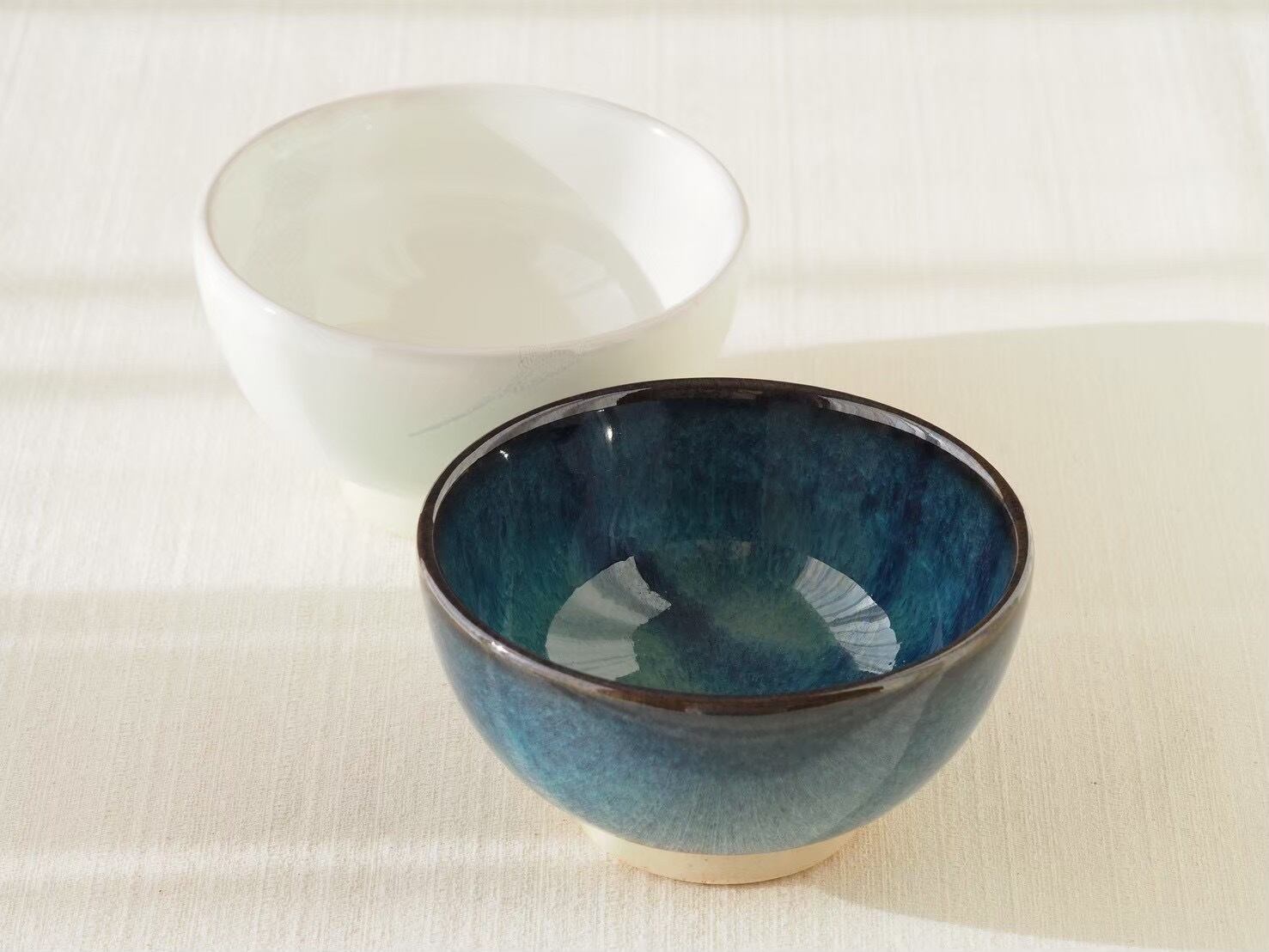 ご飯茶碗としても使える小鉢です。小鉢としては深めなのでお鍋の取り分けなどに便利です。ミニ丼を作る時にもピッタリ。こぶ志窯のメインとなる深く青い色合いが特徴的な海鼠釉と、クリーム感のある白にうっすらグレーのワンポイントが入った白釉の2種類があります。